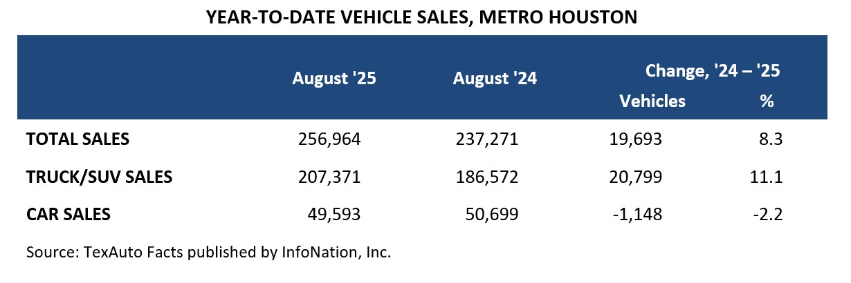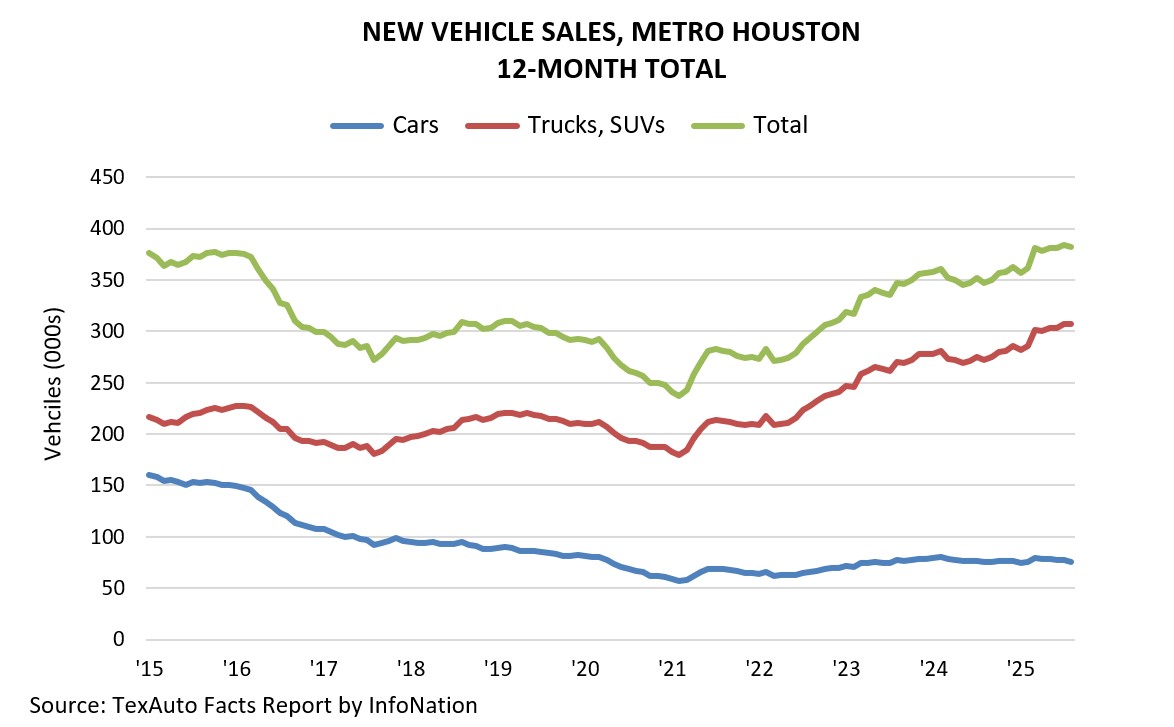 Houston-area dealers sold 382,381 new cars, trucks, and SUVs in the 12 months ending August ‘25, according to TexAuto Facts, published by InfoNation Inc. This represents a 10.1 percent increase in sales over the same period last year. Truck and SUV sales were up 12.8 percent, and car sales were almost flat, up 0.5 percent.