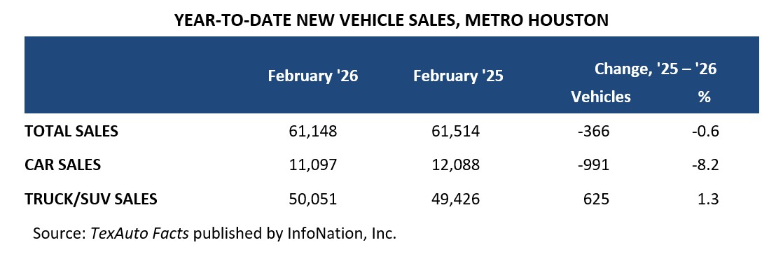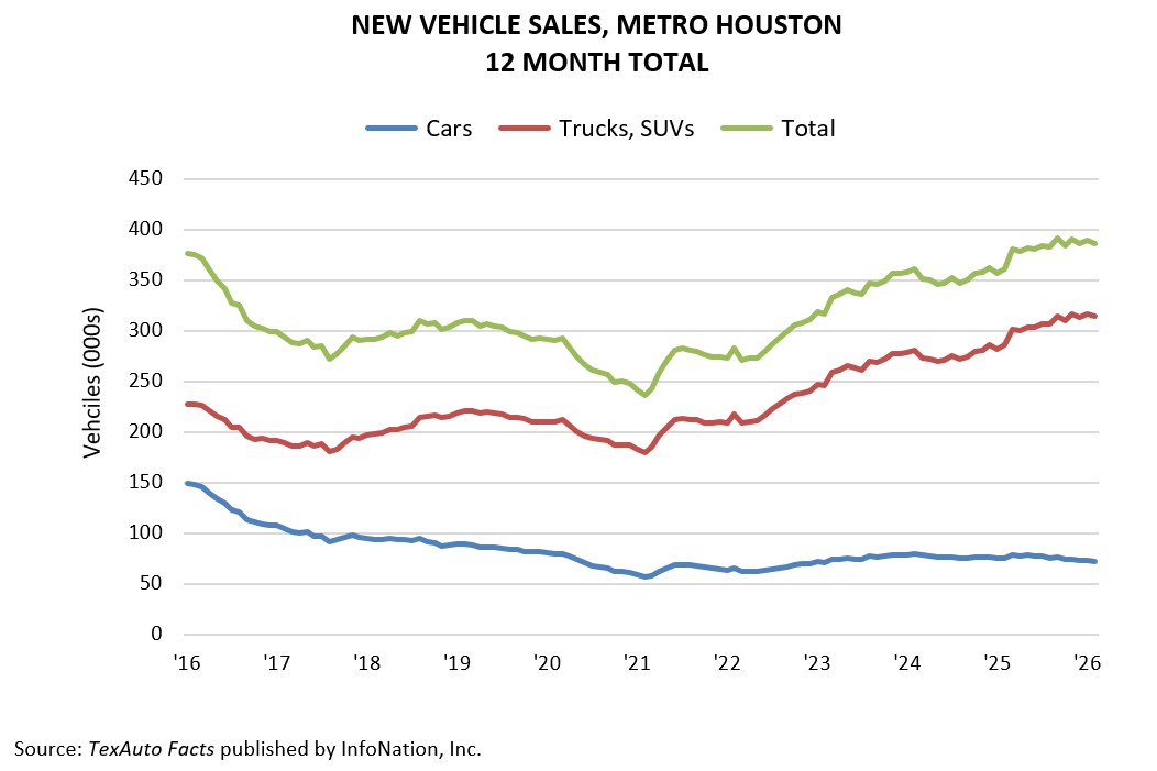 Houston-area dealers sold 385,835 new cars, trucks, and SUVs in the 12 months ending February ‘26, according to TexAuto Facts published by InfoNation Inc. Sales climbed 6.8 percent from the same period last year, driven by a 9.7 percent jump in trucks and SUVs that tempered the 4.3 percent decline in car sales, as consumer preferences continue to shift toward larger vehicles.