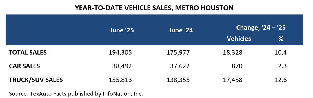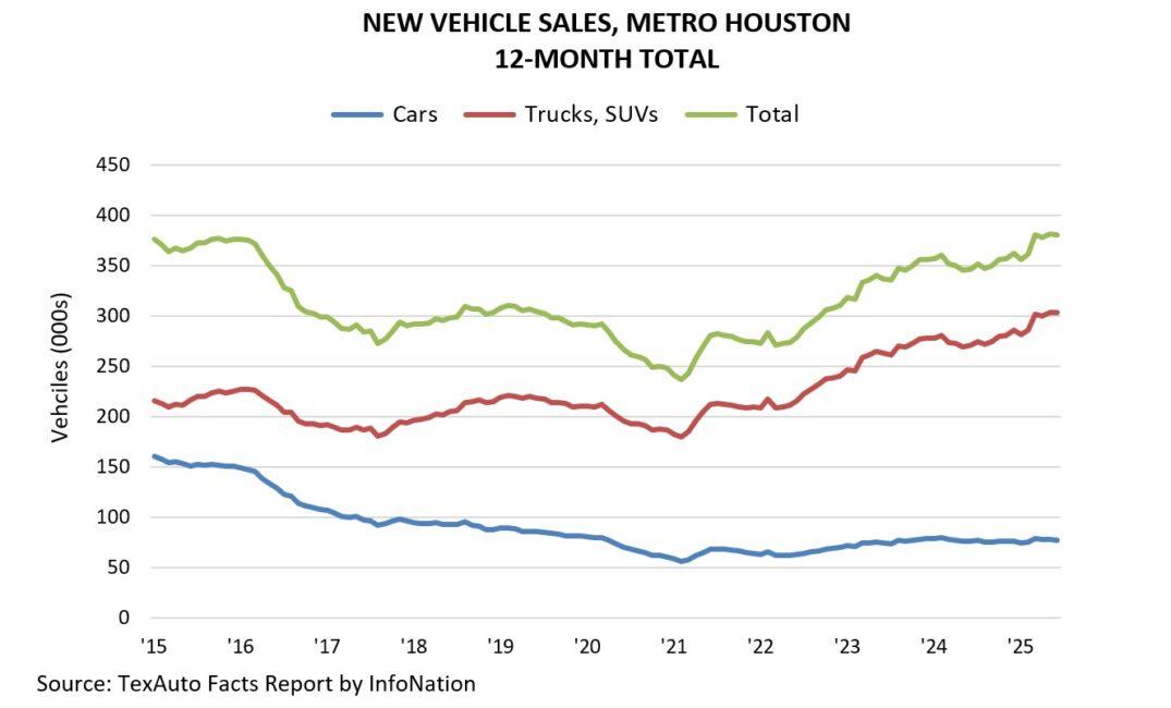 Houston-area dealers sold 382,381 new cars, trucks, and SUVs in the 12 months ending August ‘25, according to TexAuto Facts, published by InfoNation Inc. This represents a 10.1 percent increase in sales over the same period last year. Truck and SUV sales were up 12.8 percent, and car sales were almost flat, up 0.5 percent.