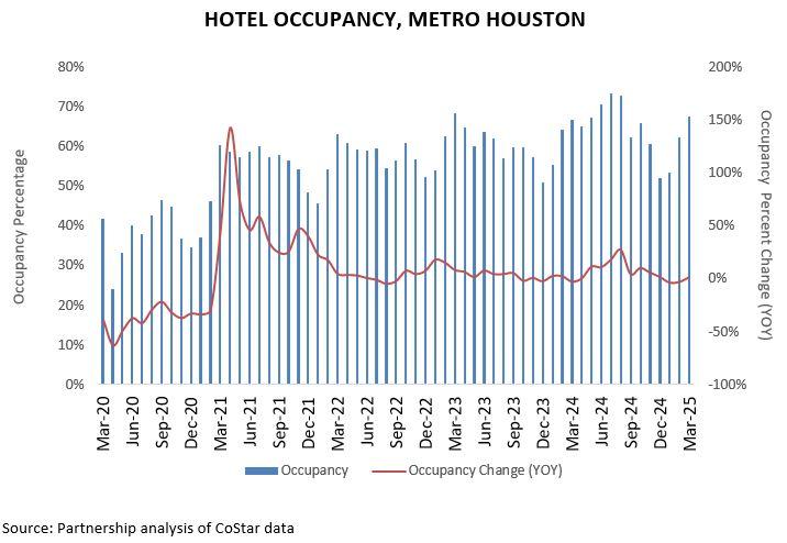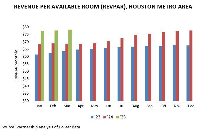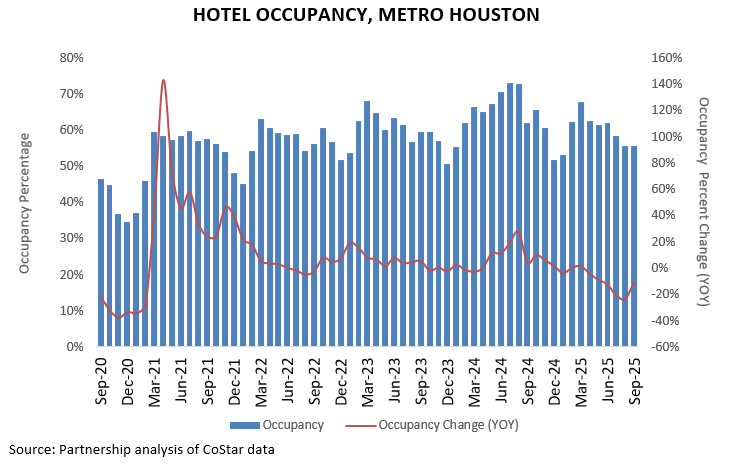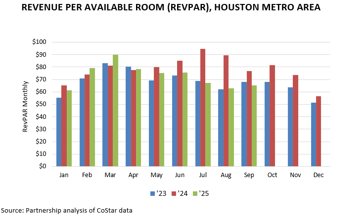 RevPAR in Houston declined to $65.43 in September ’25, down from $79.12 in September ’24, driven by weaker demand and softer rate performance. Occupancy fell year-over-year and ADR slipped, leading to the decrease in RevPAR. Summer activity included Astros home series at Daikin Park and large conventions at the George R. Brown Convention Center in July and August, along with early fall business travel and event activity at NRG Stadium and other downtown venues in September.