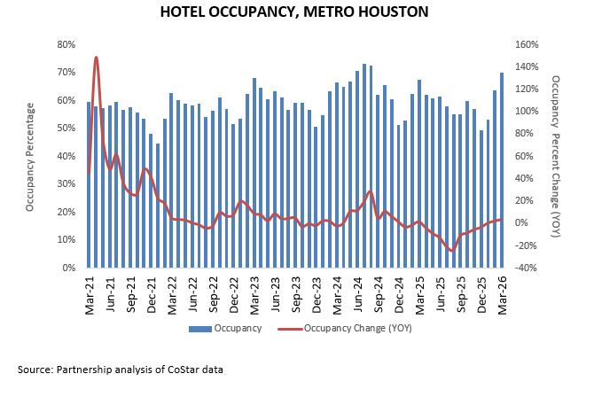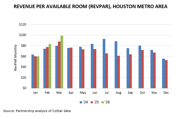 RevPAR in Houston declined across much of ’25 before improving in early ’26. After reaching $88.38 in March ’25, RevPAR fell through the summer months, and then rebounded to $98.93 in March ’26, an 11.9 percent increase year-over-year. Average daily rate remained relatively stable over the period, helping support revenue levels despite fluctuations in occupancy. The pattern reflects softer performance during much of ’25 following stronger results in ’24, with recent data indicating a return to growth.