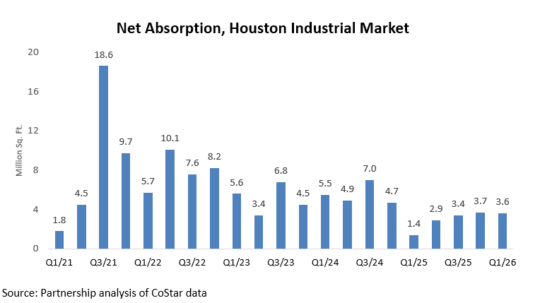 Net absorption in Houston’s industrial market has moderated from the elevated levels seen in ’24. In Q1/26, net absorption totaled 3.6 million square feet, slightly below the 3.7 million square feet recorded in Q4/25 but still below the pace recorded earlier in the cycle. This reflects relatively stable but subdued leasing activity alongside continued new supply additions.