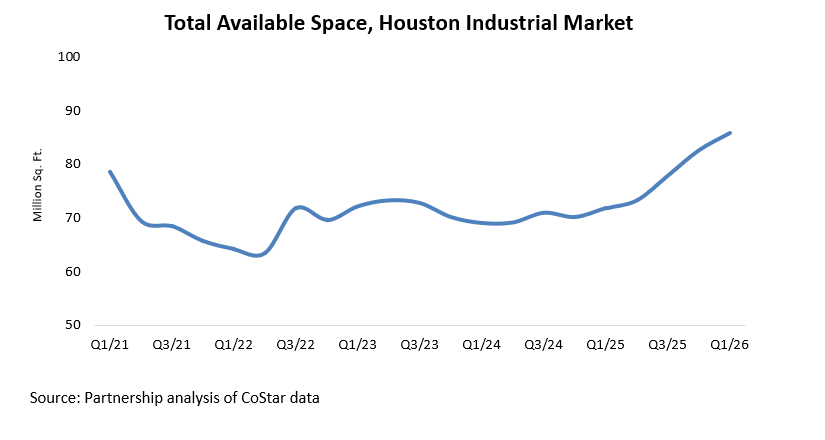 At the end of Q1/26, Houston had 85.8 million square feet of industrial and warehouse space listed as available, up from 82.6 million square feet in Q4/25. This total includes vacant, sublet, and soon-to-be-vacant space, as well as occupied space currently being marketed for lease.