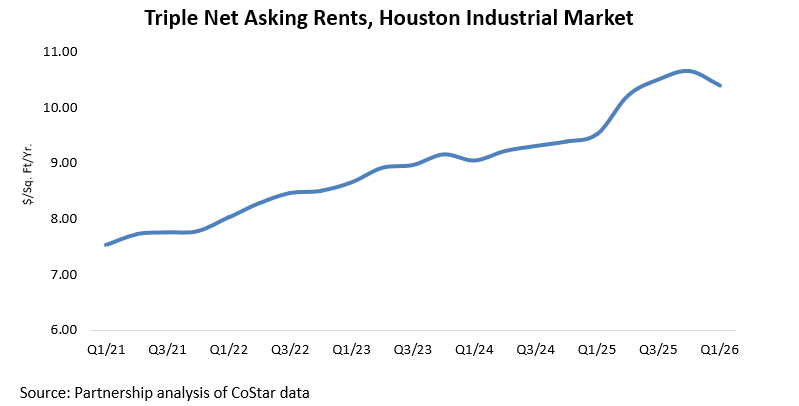 Despite softer absorption, industrial rents in Houston remain elevated. The average triple net (NNN) rent reached $10.39 per square foot in Q1/26, slightly below $10.65 in Q4/25 but up from $9.52 in Q1/25. Under NNN lease terms, tenants are responsible for expenses such as property taxes, maintenance, utilities, and security. Over the past five years, rents have increased approximately 38 percent, underscoring sustained demand for quality space even in a more cautious leasing environment.