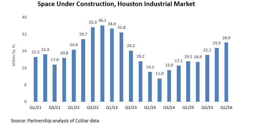 Higher interest rates, tighter lending standards, and softer absorption have slowed building activity in Houston’s industrial market. As of Q1/26, 28.0 million square feet were under construction, reflecting a continued rebound from the lows reached in mid-‘24 but remaining well below the cycle peak of 36.1 million square feet in Q4/22.