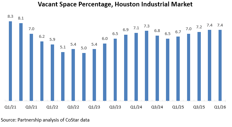 Demand for industrial and warehouse space in Houston has fluctuated over the past several years. The vacancy rate fell to a five-year low of 5.0 percent in Q4/22 amid strong absorption and record construction activity. As new supply continued to outpace demand, vacancy trended upward, reaching a cycle high of 7.4 percent in Q4/25 and remaining at that level in Q1/26.