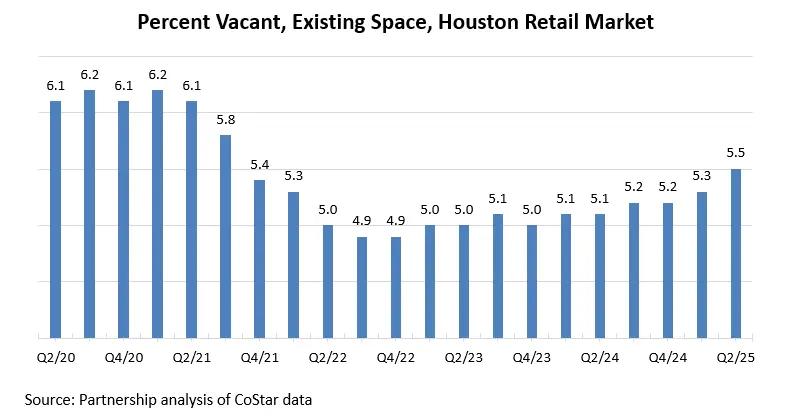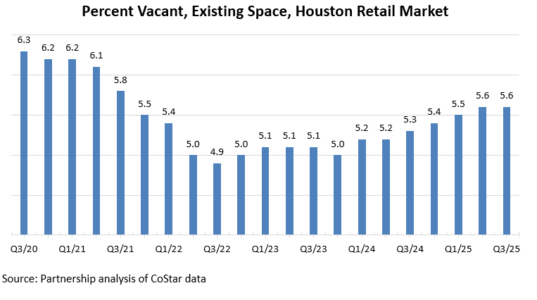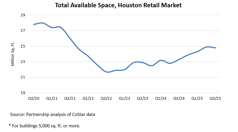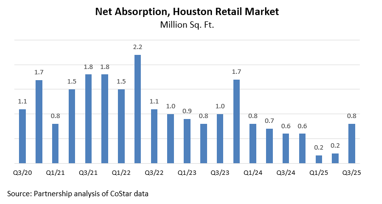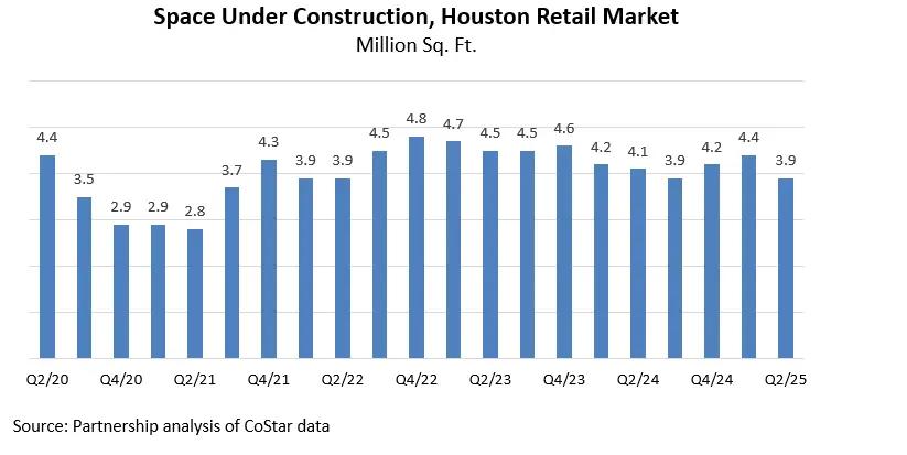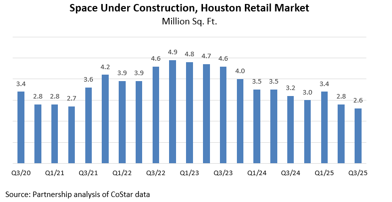 Retail construction has slowed due to higher interest rates and tighter lending standards. As of Q3/25, Houston had 2.6 million square feet of retail space underway, down from 3.2 million square feet in Q3/24 and 2.8 million in Q2/25. This marks the lowest construction pipeline since 2020, underscoring a more cautious development environment.