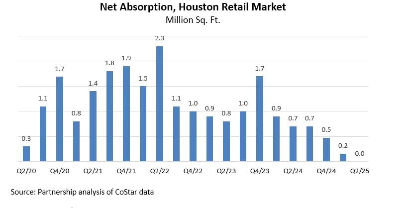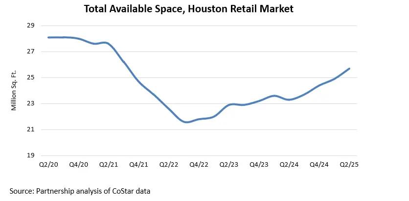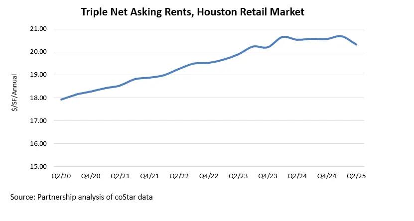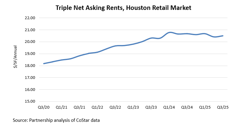 After years of steady growth, retail rents in Houston have largely stabilized since 2024. The average triple net (NNN) rent measured $20.51 per square foot in Q3/25, just below the recent high of $20.79 in Q1/24 and essentially unchanged from year-ago levels. These rates are quoted as NNN, meaning tenants are responsible for covering expenses such as property taxes, maintenance, utilities, and security. The leveling of rents suggests a more mature phase of the cycle, with pricing holding near record levels despite a more cautious leasing environment.